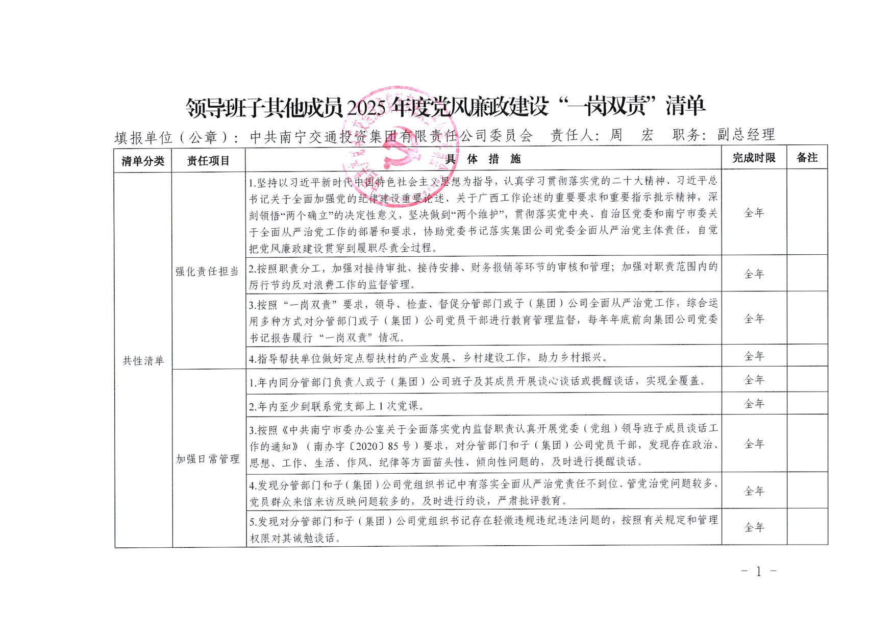 南寧交投集團領(lǐng)導(dǎo)班子其他成員2025年度黨風廉政建設(shè)“一崗雙責”清單(五)