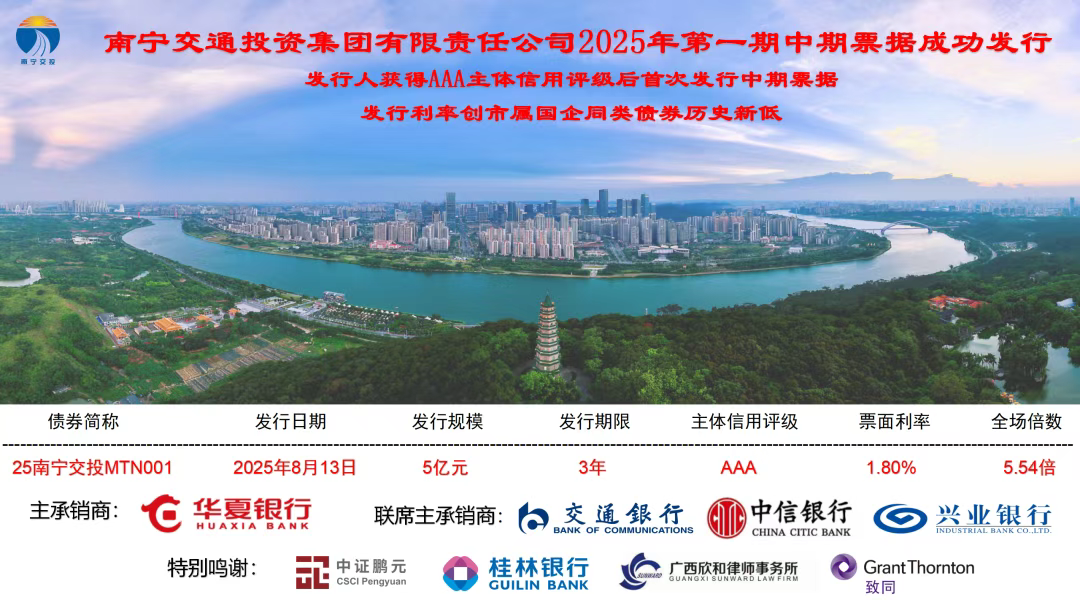 憑借良好的經(jīng)營業(yè)績、穩(wěn)健的財務(wù)表現(xiàn)和優(yōu)異的發(fā)展前景,8月13日,南寧交投集團成功發(fā)行2025年度第一期中期票據(jù),發(fā)行金額5億元,期限3年。