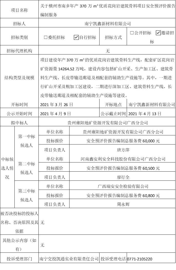 南寧公共交通集團有限公司對友愛充電站配電設(shè)施遷改項目的施工單位進行了競爭選聘,評審工作于2021年4月7日結(jié)束,現(xiàn)將中標結(jié)果公示如下:一、項目名稱:友愛車場充電站箱式變壓器配電設(shè)施遷改項目二、中標單位:廣西致晟電力科技有限公司三、中標單位報價:人民幣壹拾叁萬零伍拾貳元整(¥130,052.00)。四、招標人單位地址:南寧市青秀區(qū)民族大道184號 聯(lián)系人和電話:覃工 0771-5672034五、公示時間:2021年4月7日至2021年4月13日...